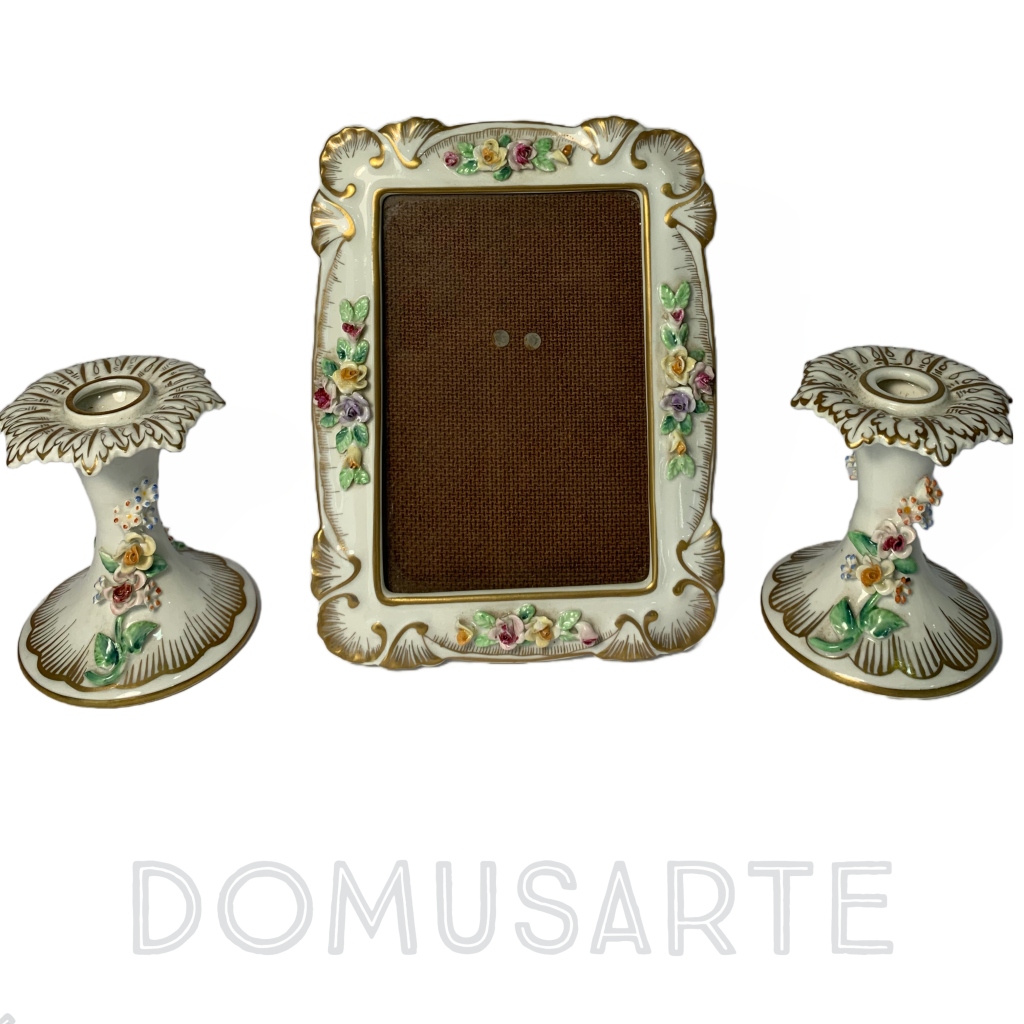 em porcelana da Fábrica Ártibus / Aveiro, composto por dois castiçãis e uma moldura, pequenas falhas,Medidas: moldura 18,5 cm x 13 cm ; castiçal 9 cm de altura