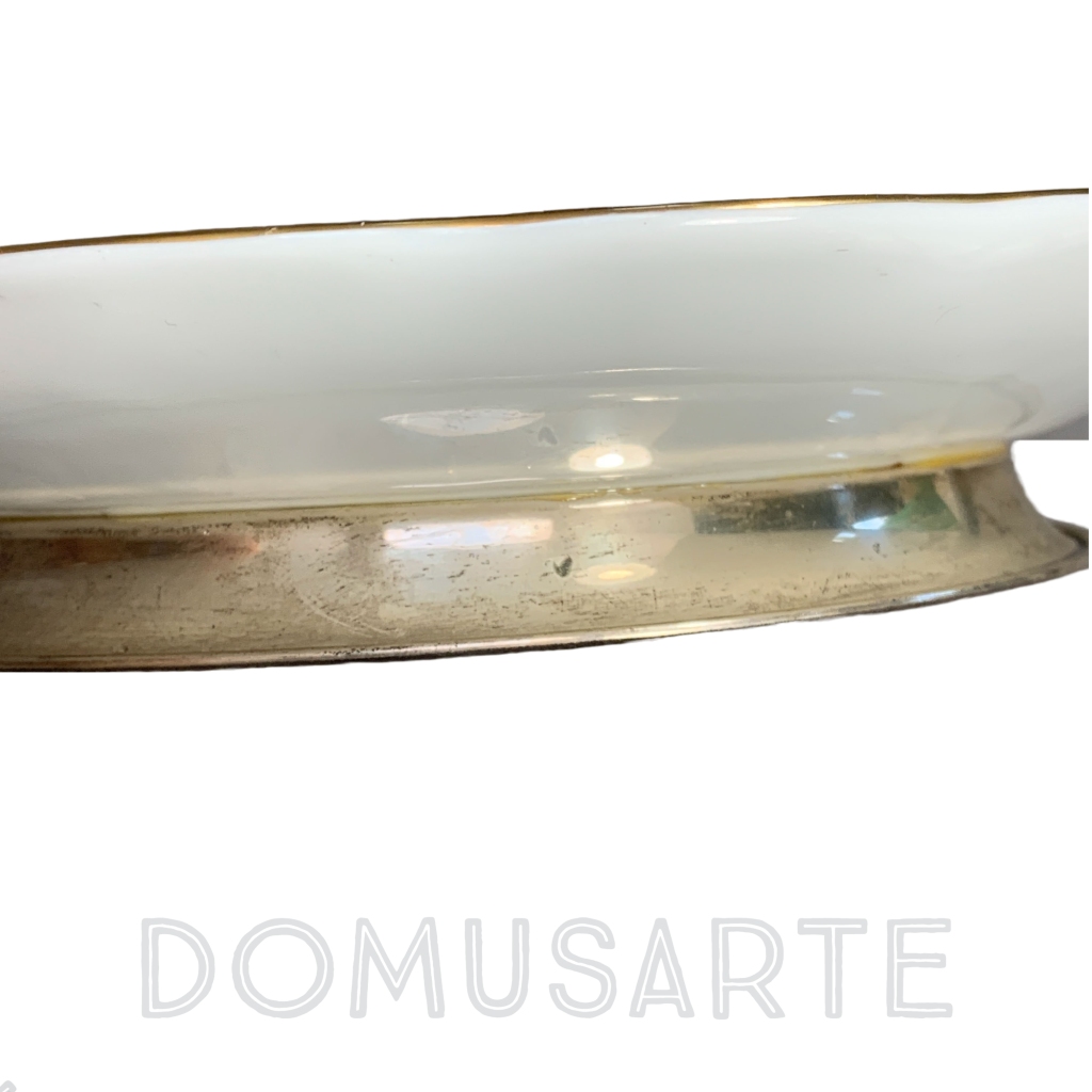 em porcelana ,decoração policromada, com grinadas , ouro e o bordo com uma faixa em cobalto, fabrico da NG, com aro na base em prata , contrastada Águia , em prata 925/1000, Medidas: 26 cm de diâmetro