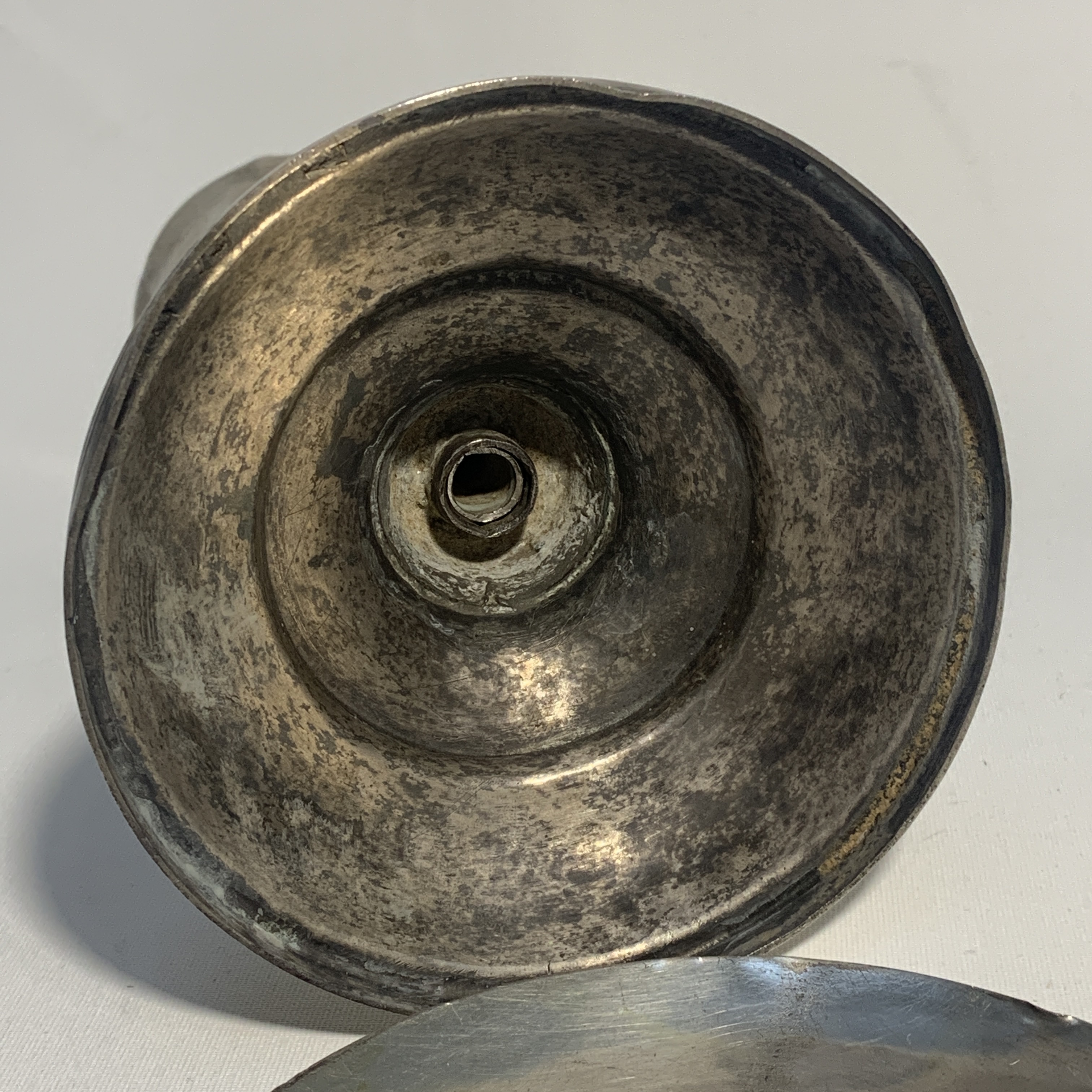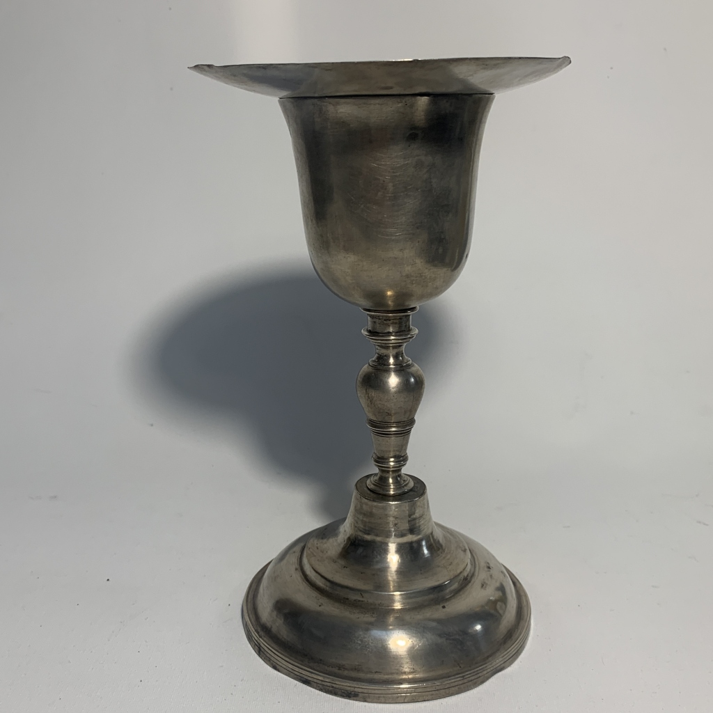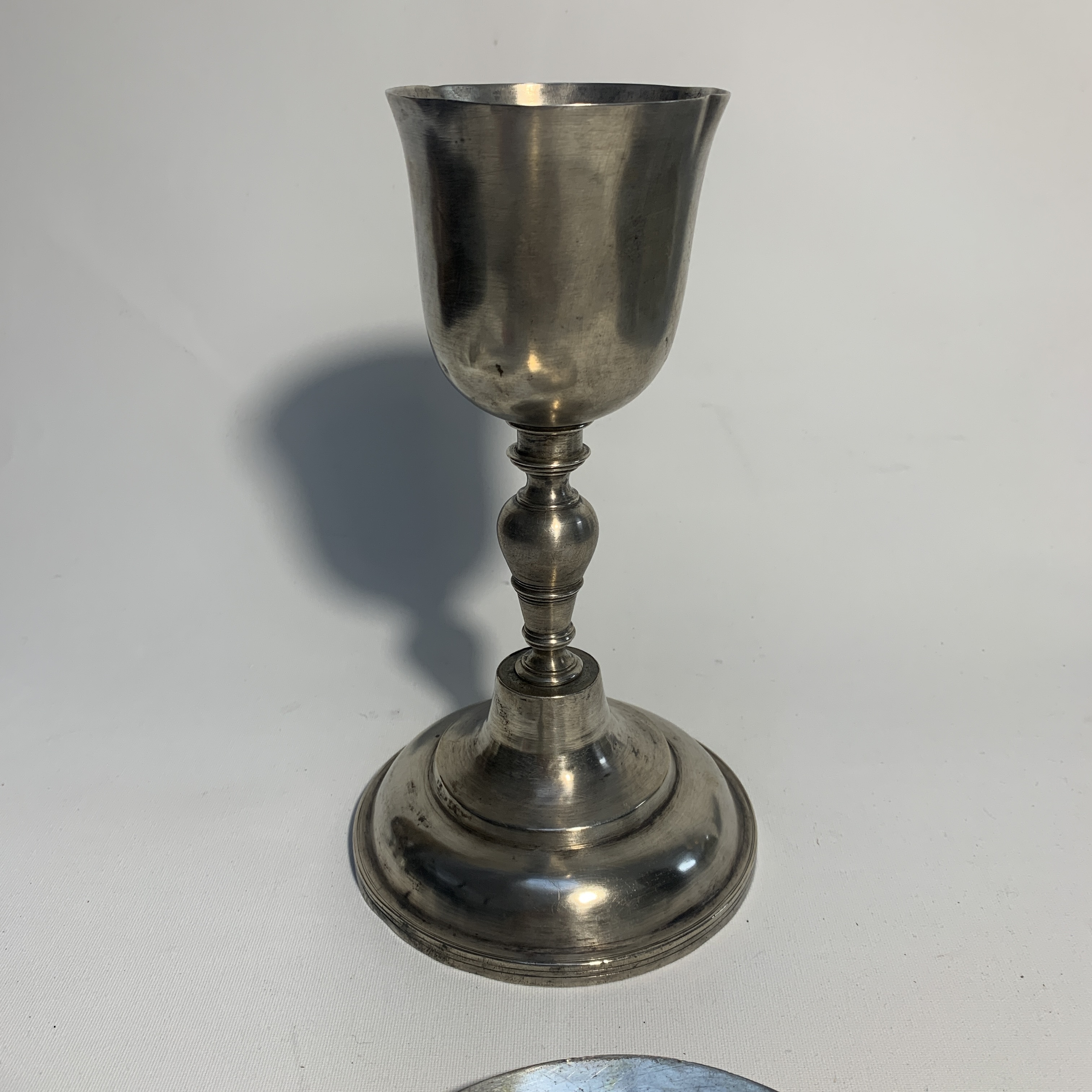 com sinais de uso, desgaste; Dim.: 21 cm de altura x 12 cm de diâmetro na base., Patena 13,5 cm de diâmetro Peso Caliçe 256,5 gr. ; Patena 90,5 gr.- sem marcas portuguesas, ao abrigo do Decreto-Lei nº 120/2017, de 15 de Setembro - art. 2, nº 2, alínea c)