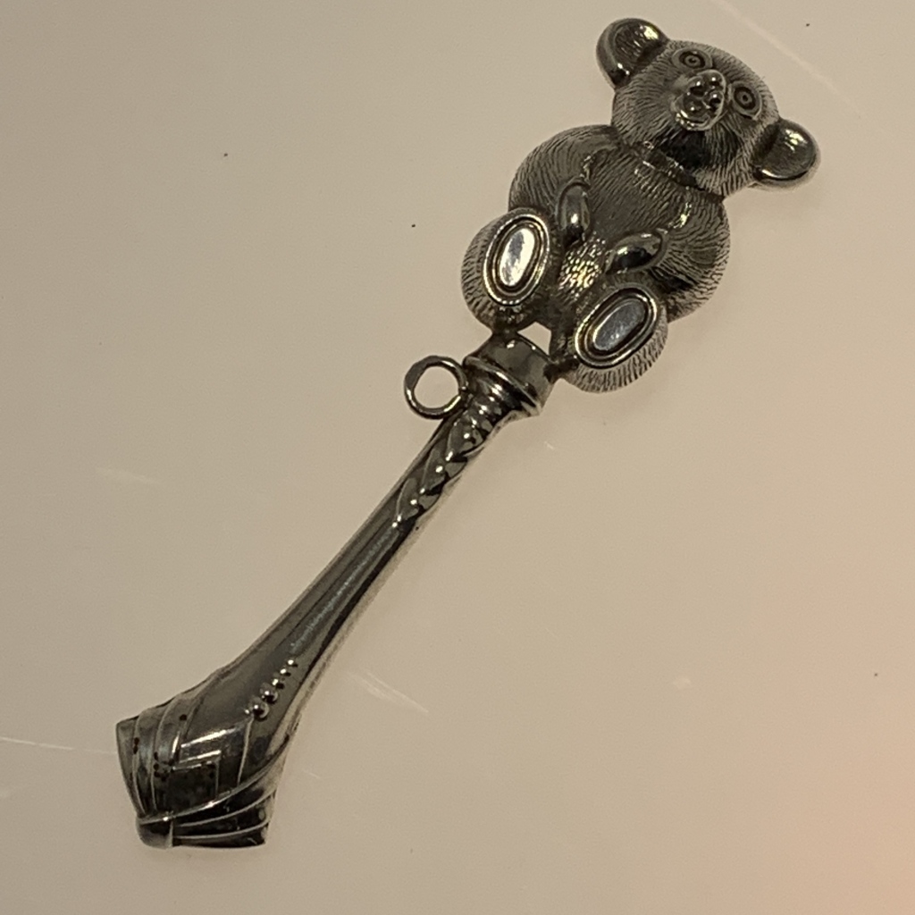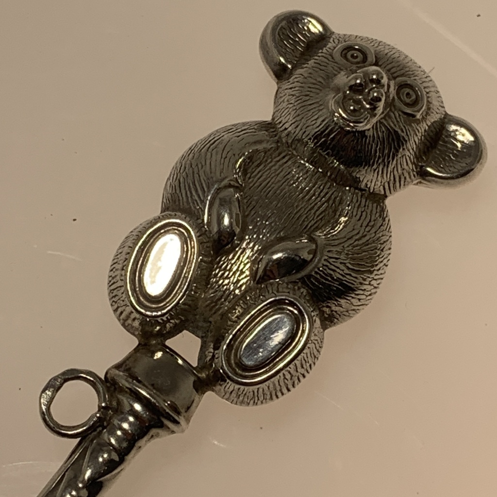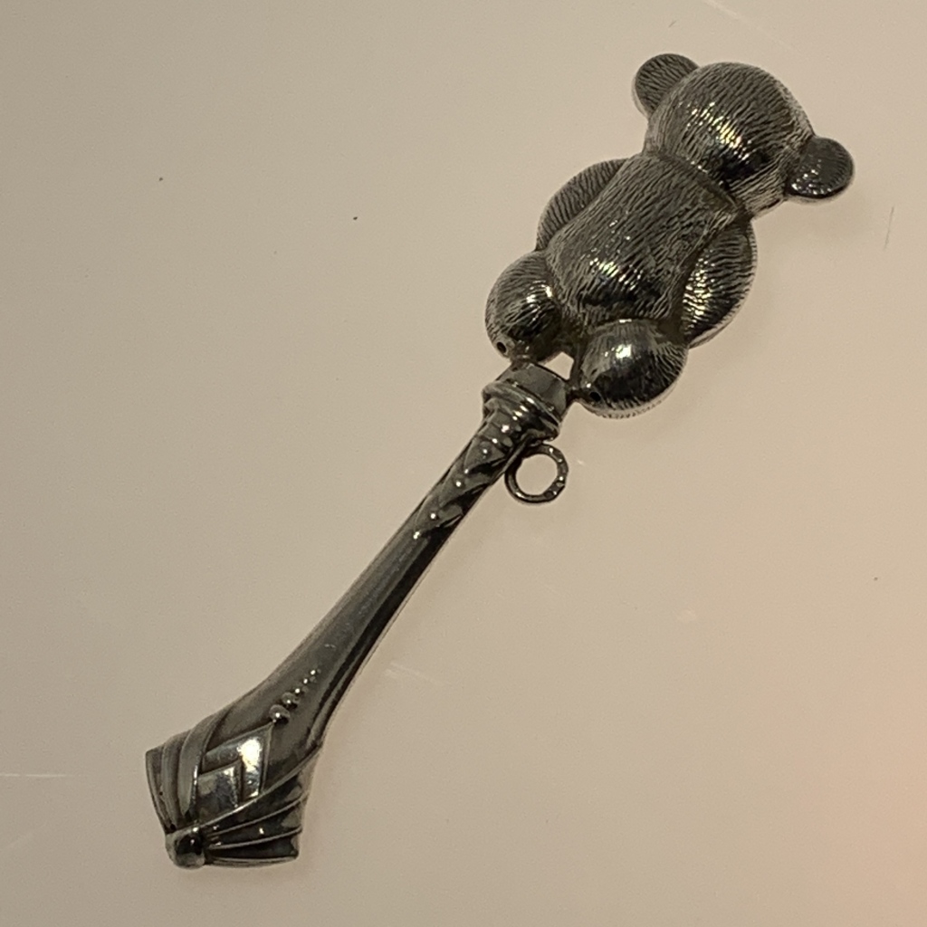em prata de 925/1000, decoração formato de "Ursinho", com pega e argola para fixar, contrastada, com sinais de uso; Dim.: 11,5 cm; Peso: 19gr.