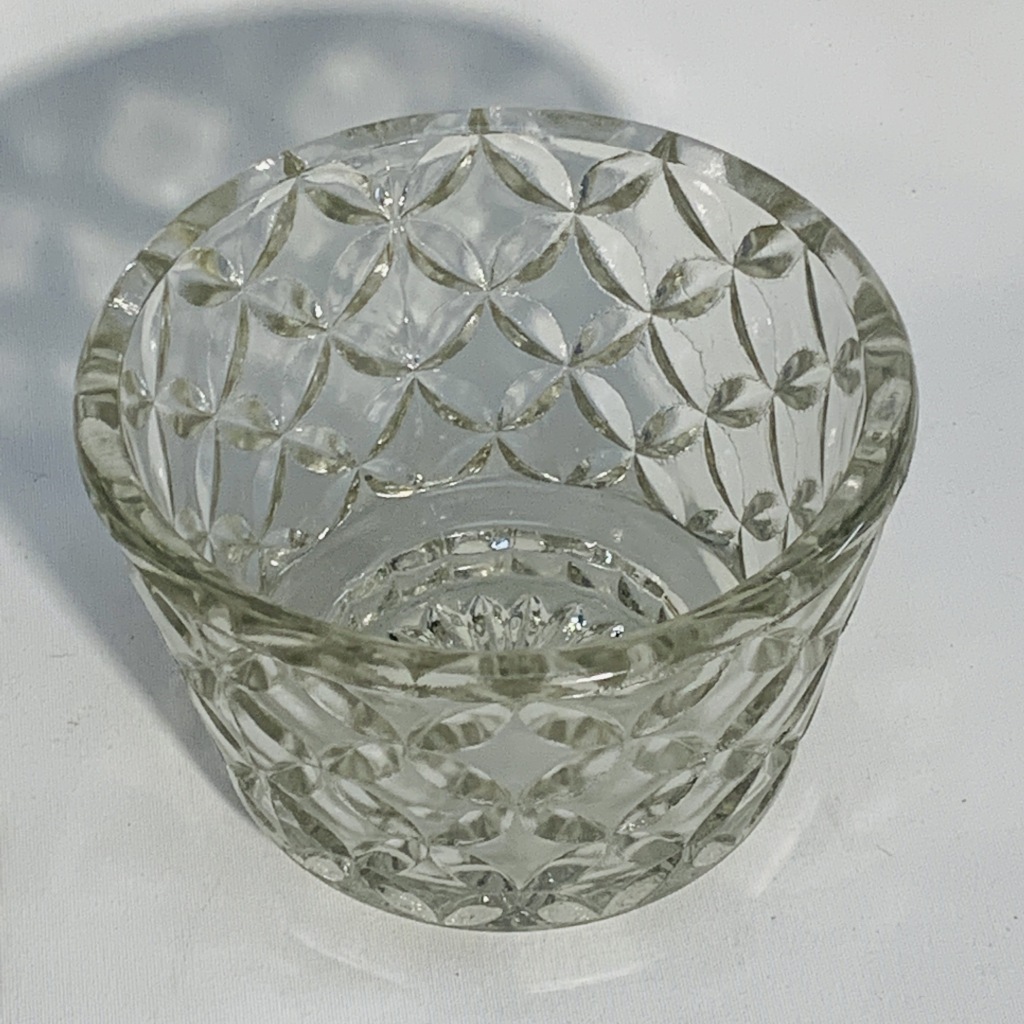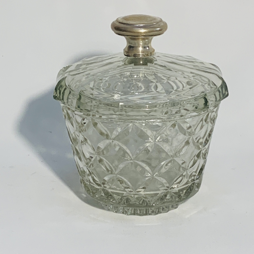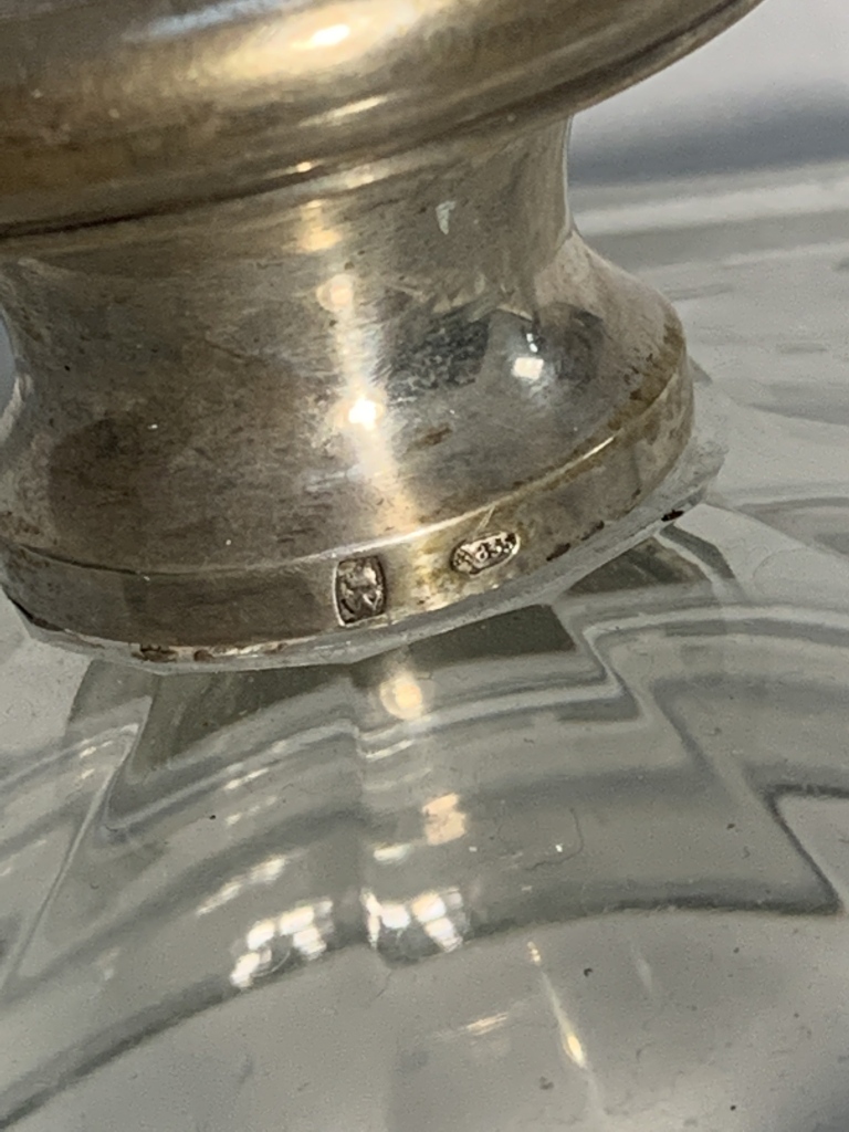 em vidro, com pega em prata, contrastada 835, prata alemã, Séc XX, sem marcas portuguesas, ao abrigo do Decreto-Lei nº 120/2017, de 15 de Setembro - art. 2, nº 2, alínea c) , sinais de uso, e desgaste, Dim.: 19 cm de altura x 17 cm de diâmetro