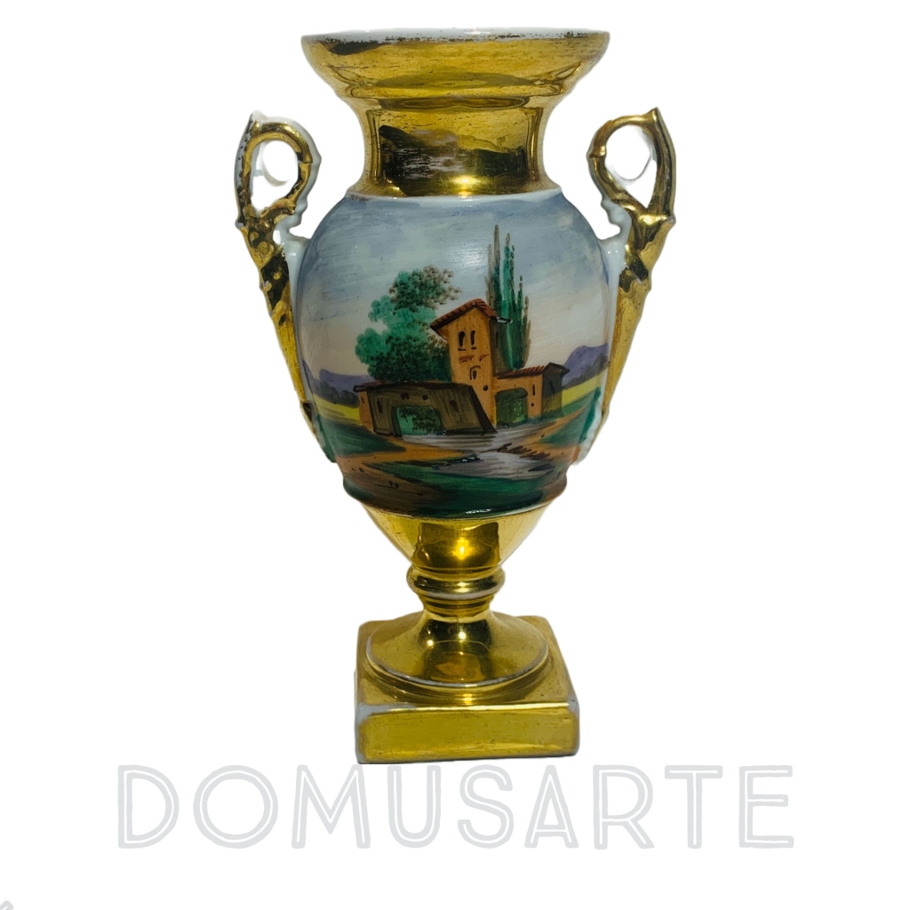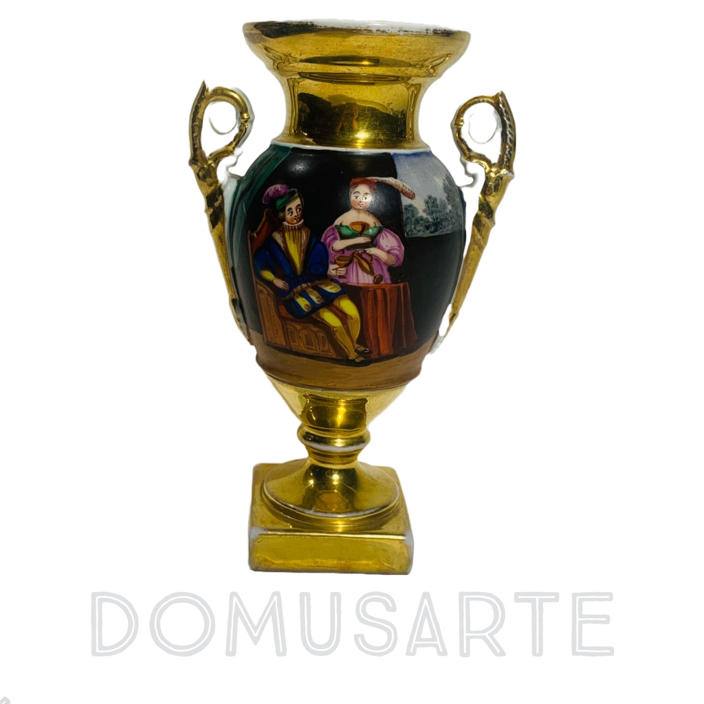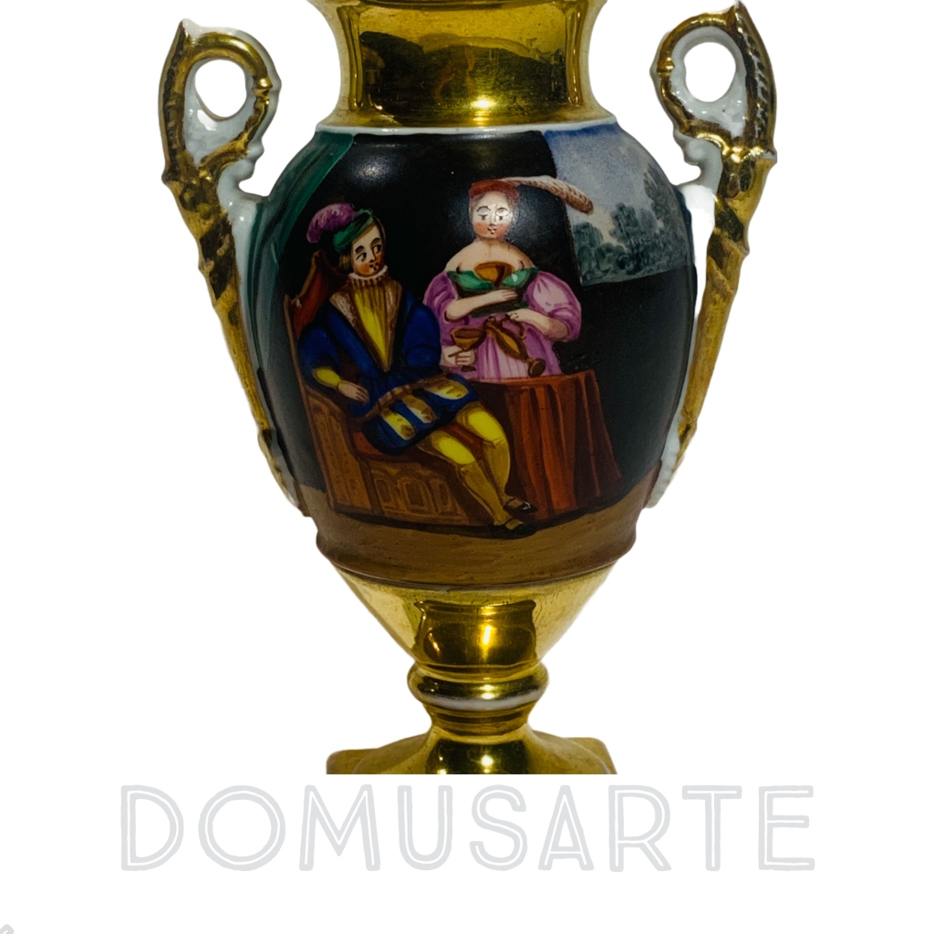 em porcelana, policromada, Séc XIX, França, possivelmente "Vieux Paris" com sinais de uso algum desgaste no dourado, Dim.: 18,5 cm de altura