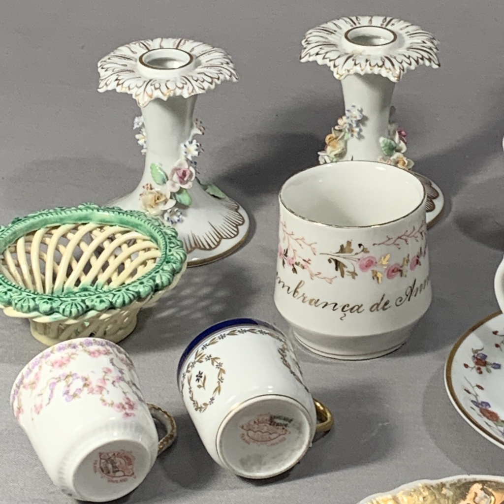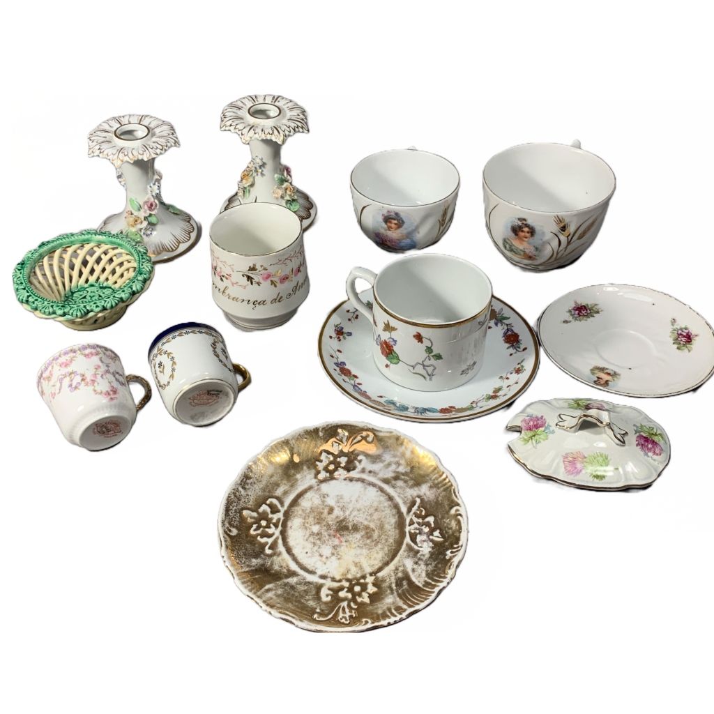 várias peças da Vista Alegre, Artibus e Caldas, castiçais , chávenas e pires. Cesto (13), Dim.: 13 cm de diâmetro ( a maior)Nota: com sinais de uso, desgaste e pequenas falhas