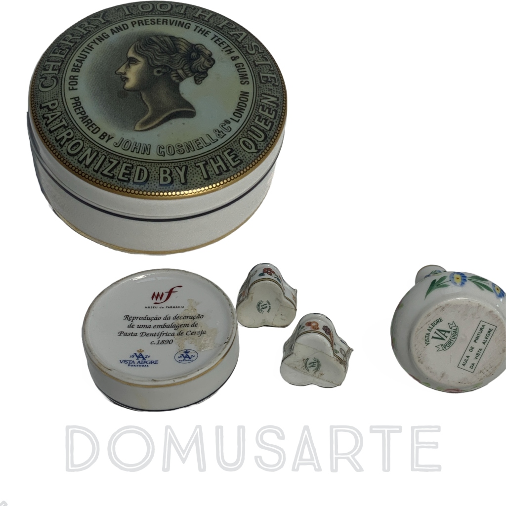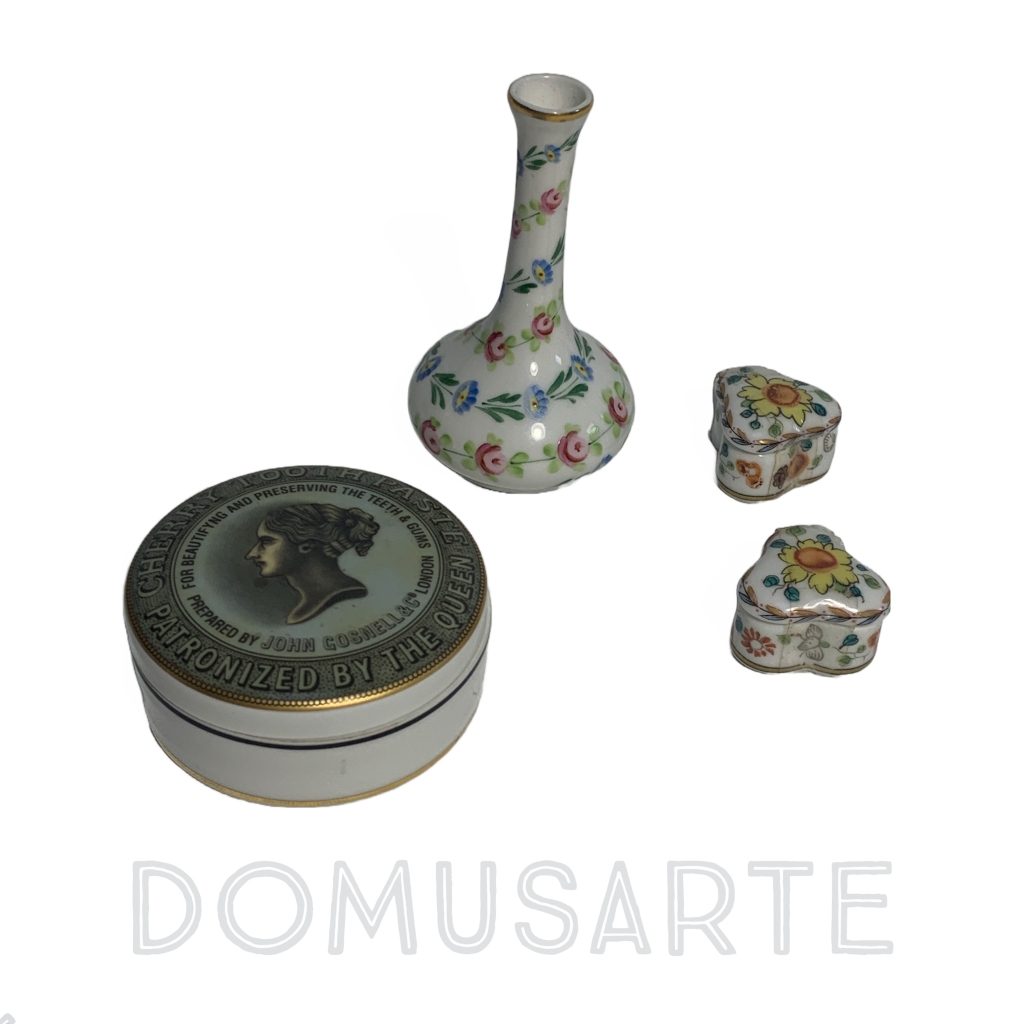 composto por Jarrinha, Caixa redonda e duas caixinhas, marcadas, diversas marcas,-Medidas: Jarrinha 8 cm de altura , caixa redonda: 6 cm de diâmetro.Nota: com sinais de uso