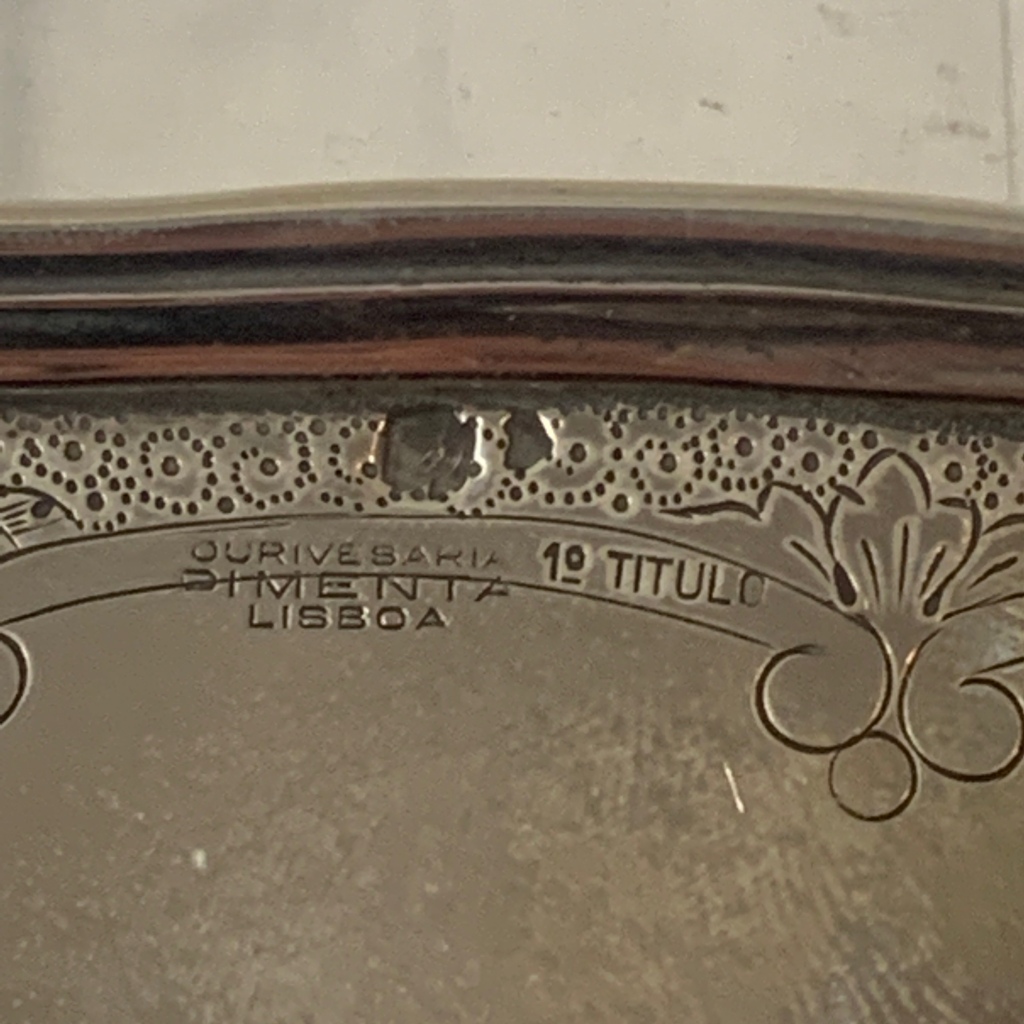 bordo com trabalho cinzelado, fabricada e marcada pela Ourivesaría Pimenta Lisboa, 1º Titulo,peça imponete e em bom estado, com alguns sinais de uso.Peso: 1480gr.Medidas: 32cm x 49cm
