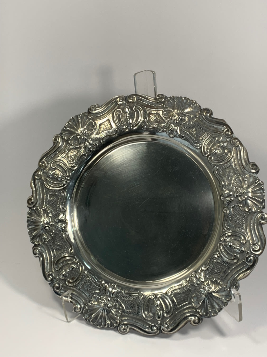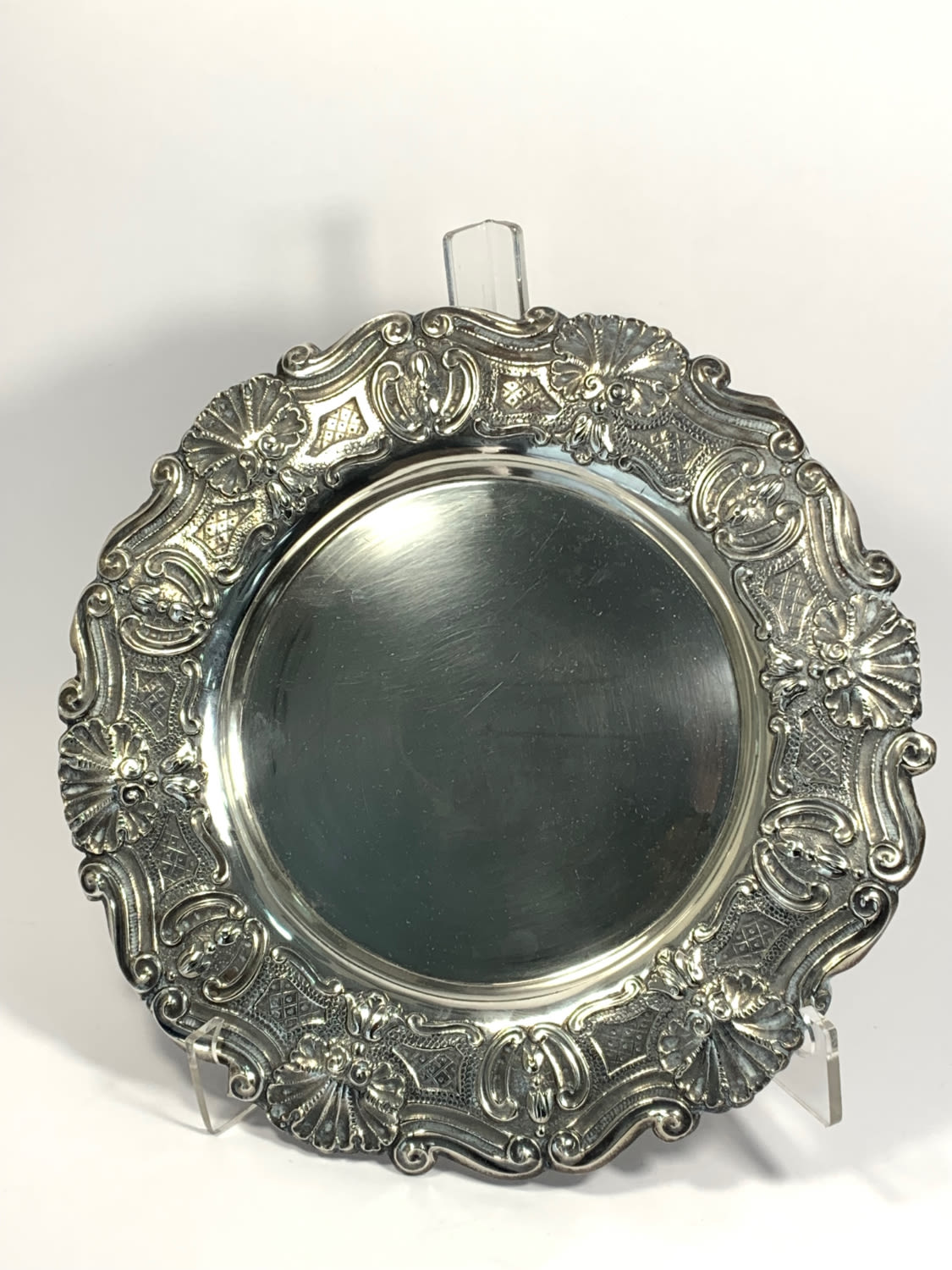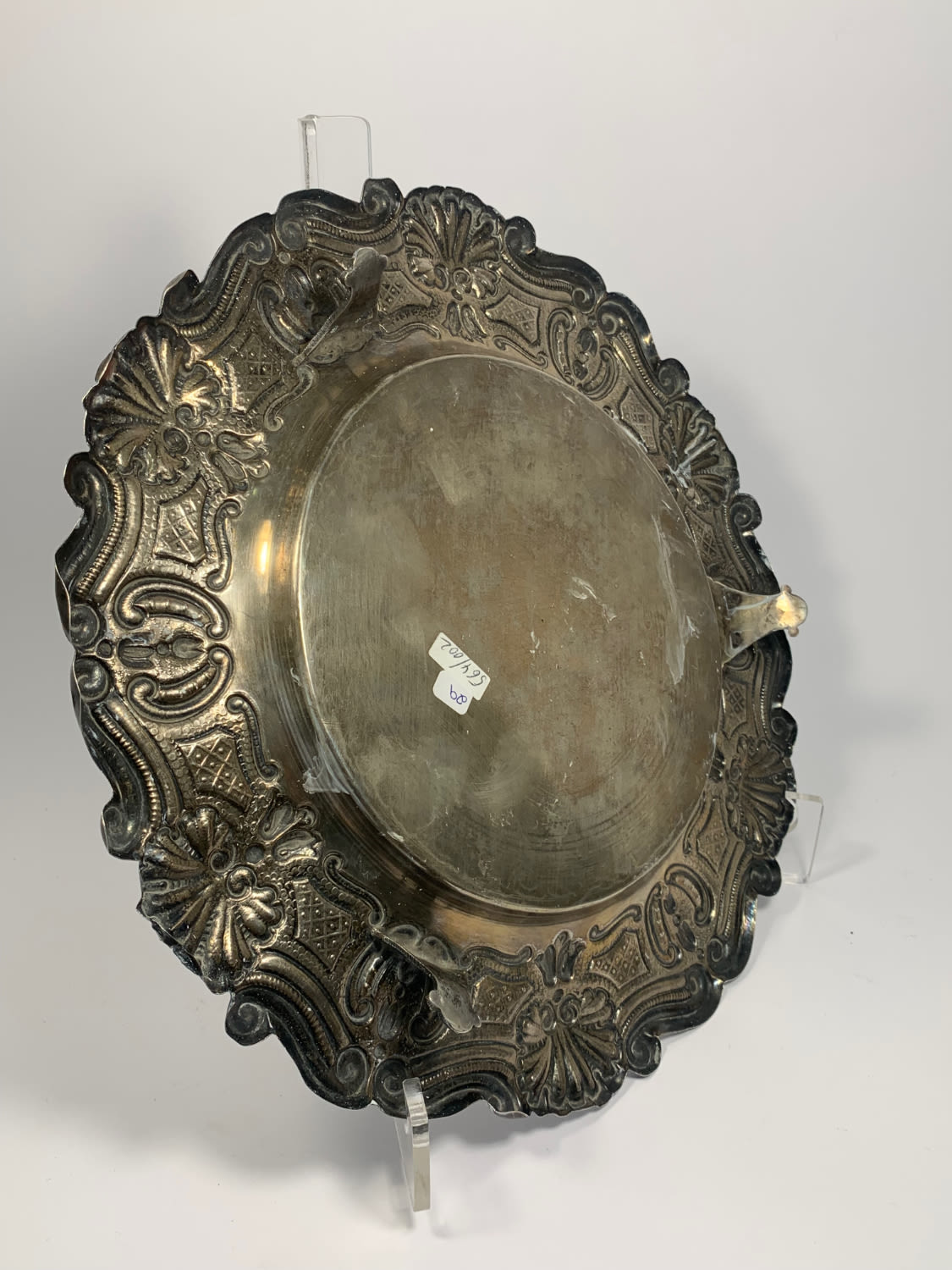 em prata de 833/1000 fundo liso, aba relevada com Flores e concheados, assente sobre 3 pés