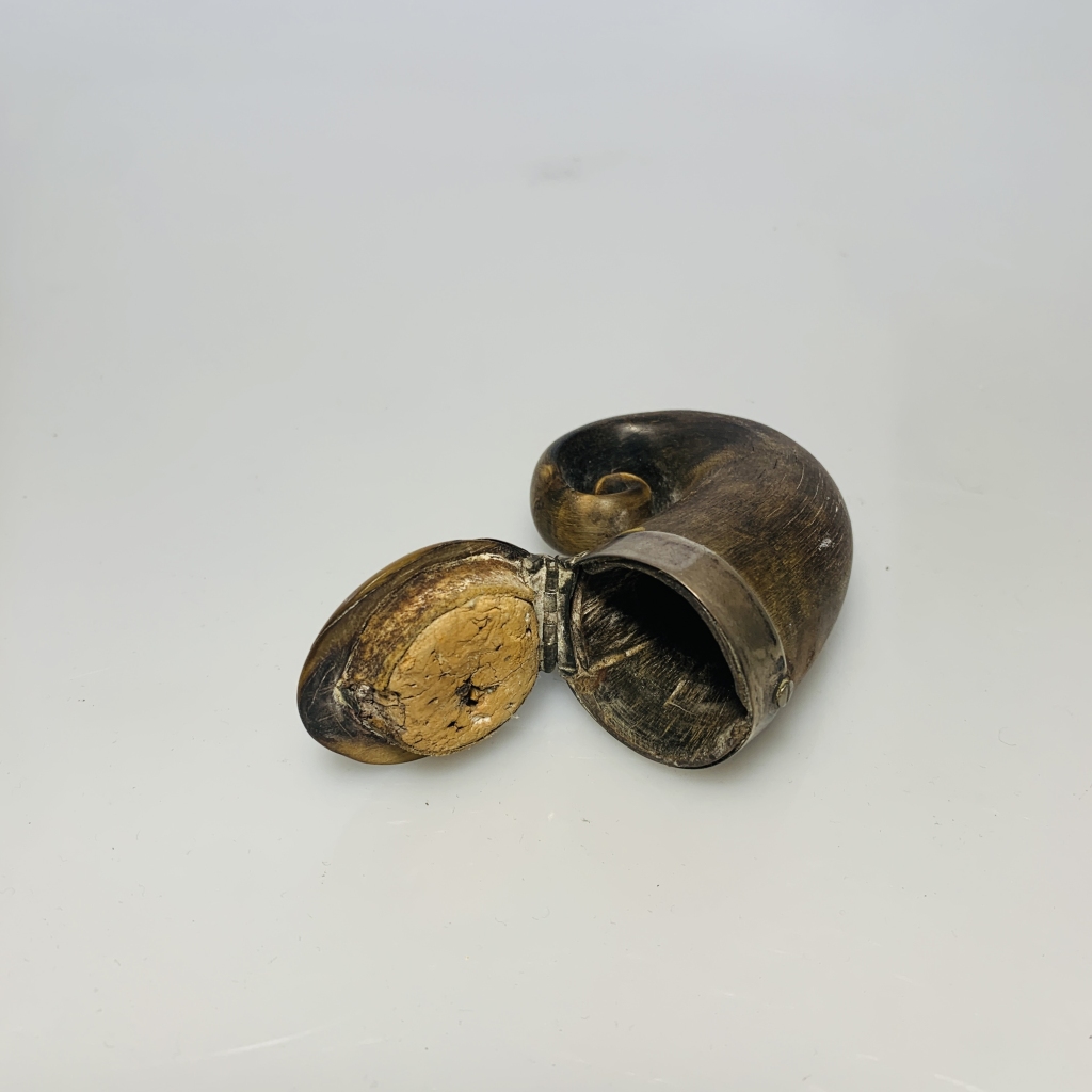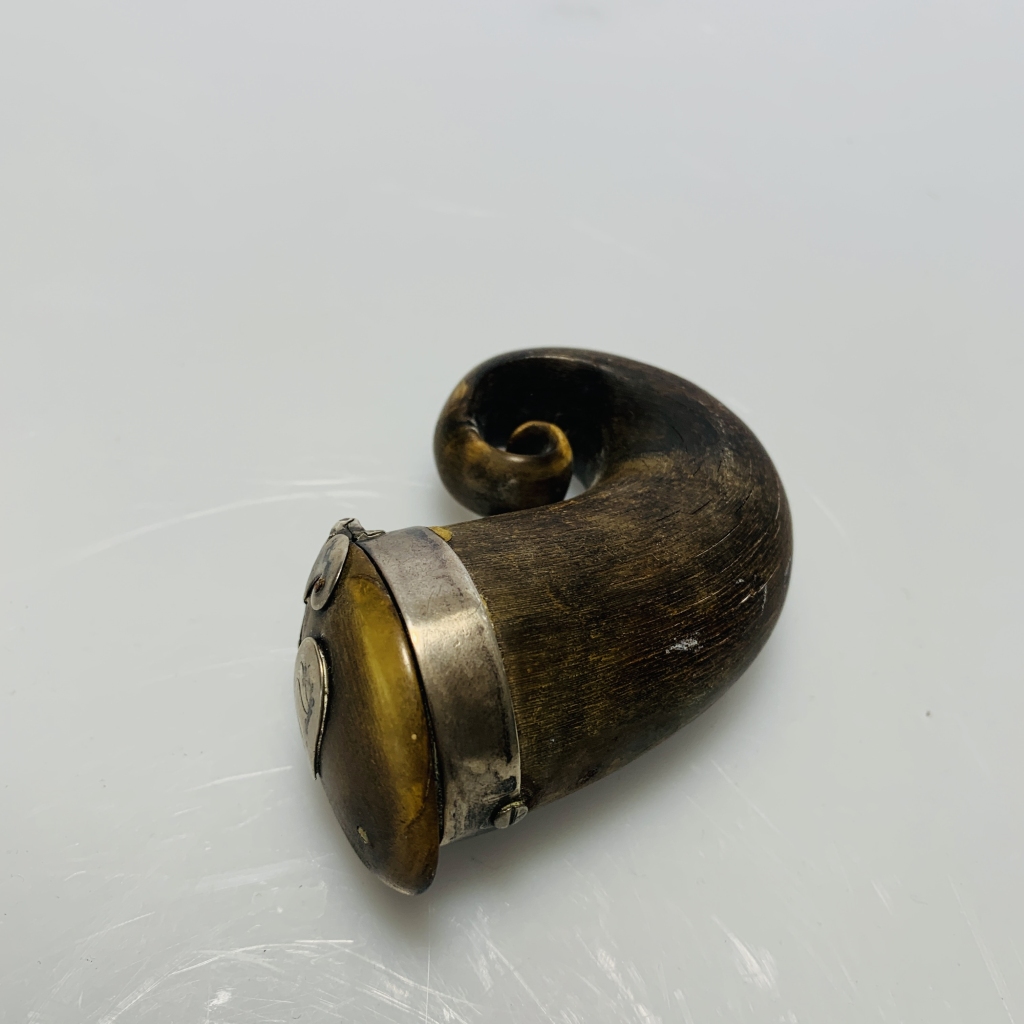 em material córnea, com aro e apliques em prata, monograma na tampa, HV? , Inglesa, Séc XVIII/XIX, com falhas, faltas e desgaste, sem marcas portuguesas, ao abrigo do Decreto-Lei nº 120/2017, de 15 de Setembro - art. 2, nº 2, alínea c); Medidas: 7 cm