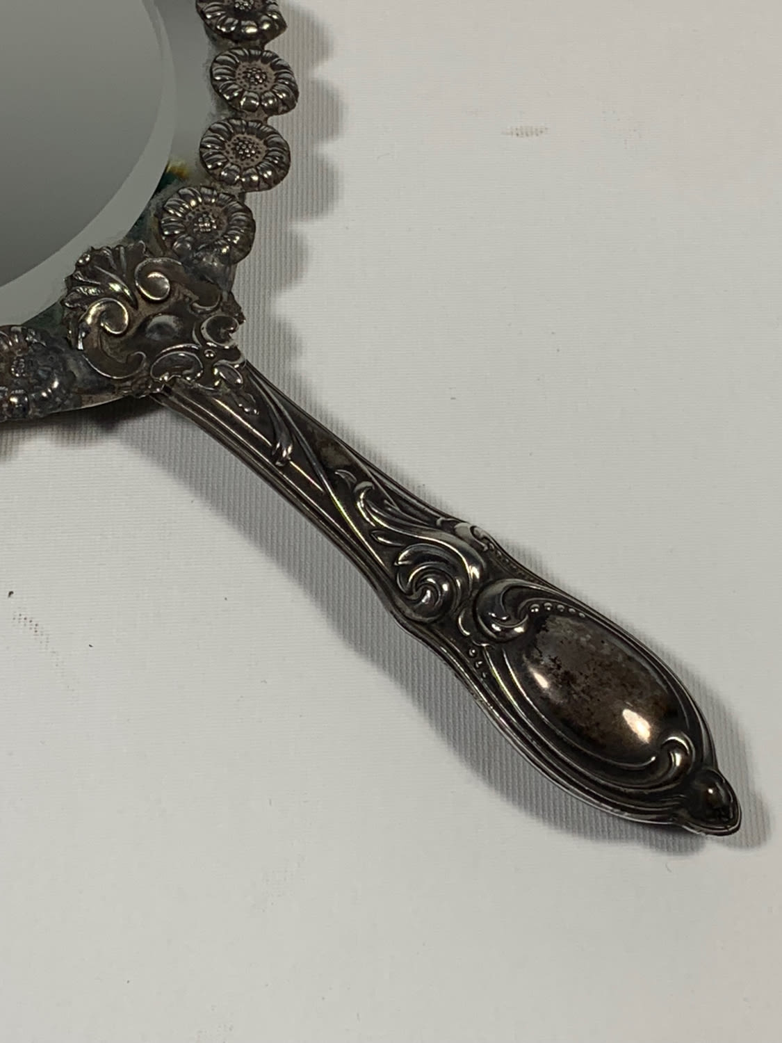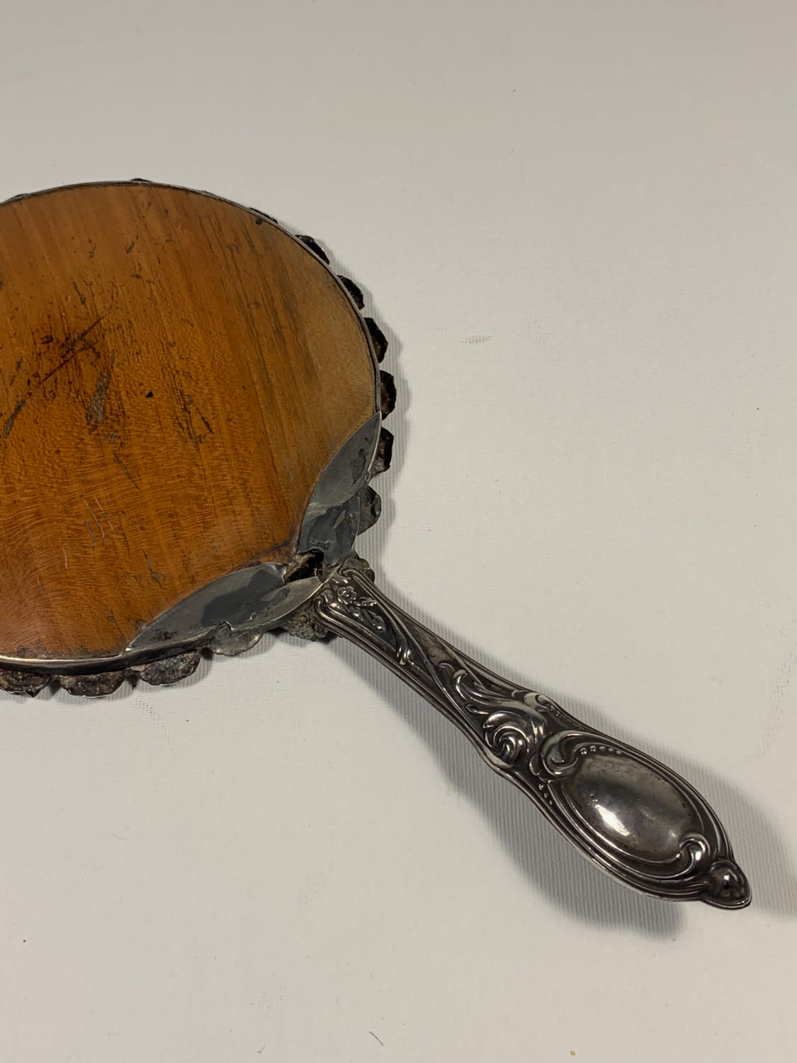 prata de 833/1000, espelho biselado, no verso com madeira , com restauro e desgaste,
