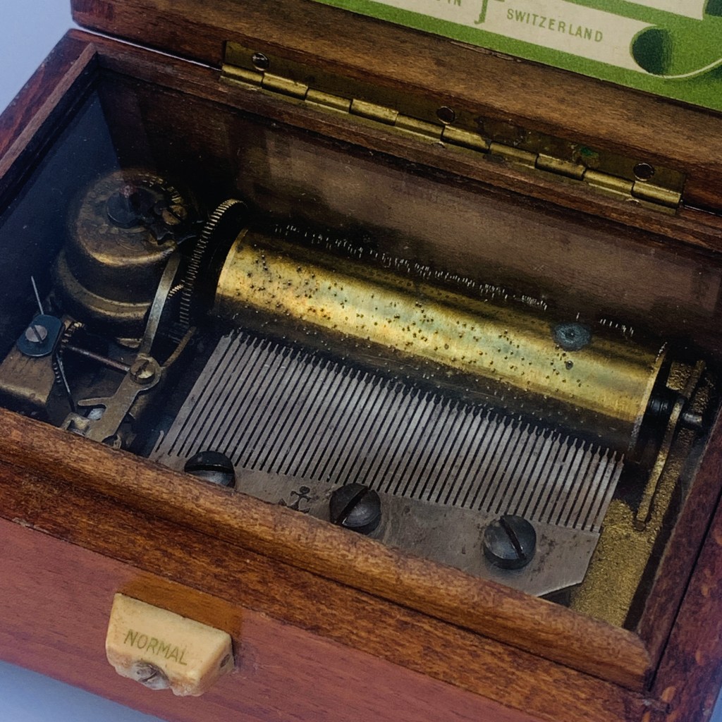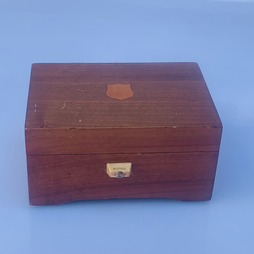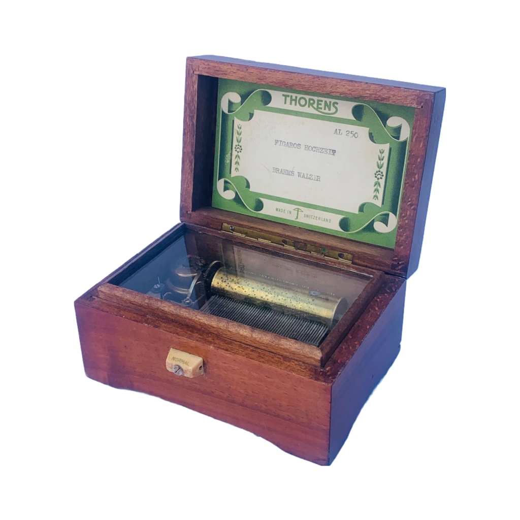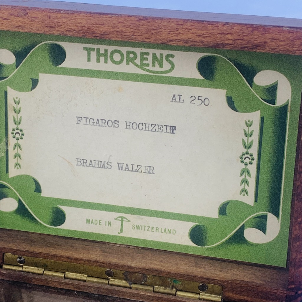 em madeira, Fabrico Thorens - Suiça- com a musica - Figaros Hochzeit - Brahms Walzer - Dim.: 12,9 cm x 9 cm x 6,5 cm de altura- Com sinais de uso,
